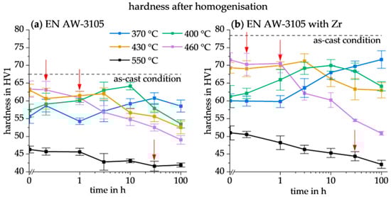 Hardness after homogenisation of (a) EN AW-3105 and (b) EN AW-3105 with Zr. Selected states for microstructure analysis are marked with arrows.