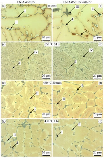 Light microscopic images of the WECK-etched alloys, EN AW-3105 and EN AW-3105 with Zr, in the as-cast (a,b), homogenised at 550 °C for 24 h (c,d), homogenised at 460 °C for 20 min (e,f) and homogenised at 430 °C for 1 h (g,h) states. Particle types I to IV are described in the text.