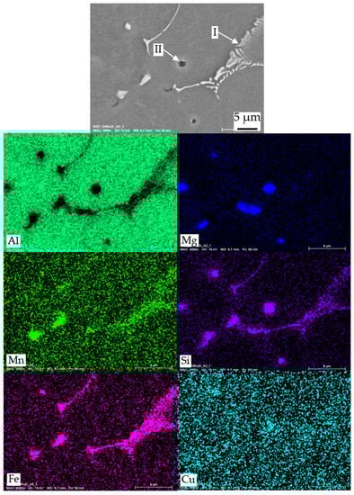 SEM-EDS mapping of the EN AW-3105 alloy (particle types I and II) in the as-cast state. Particle types I and II are described in the text.