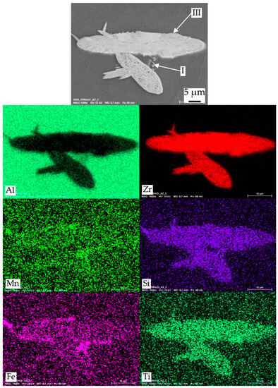 SEM-EDS mapping of the EN AW-3105 alloy with Zr (particle type III) in the as-cast state. Particle types I and III are described in the text.