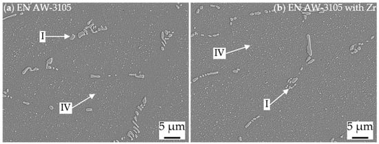 SEM images of the etched alloys, (a) EN AW-3105 and (b) EN AW-3105 with Zr, after homogenisation at 550 °C for 24 h. Particle types I and IV are described in the text.