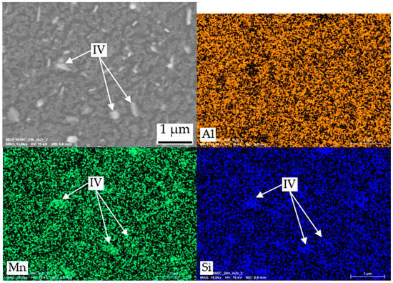 Figure 5c,d show the microstructure of both alloys after homogenisation at 550 °C for 24 h. The Chinese script-shaped eutectic (I) is still visible but appears more compact and remodelled. No bluish precipitates occur, i.e., all primary β-Mg2Si or Q-MgSiCu phases were dissolved during homogenisation. Within the dendrites, many small particles (marked as IV) are obvious. In the light microscope images, these particles tend to be shown larger due to etching. SEM examinations (see Figure 8) show that these particles are a few100 nm in size and EDS shows that they contain Mn and Si (see Figure 9). Thus, it is likely that these are dispersoids of type α-Al(Mn,Fe)Si. No differences can be seen between the two alloys in the light microscope images.