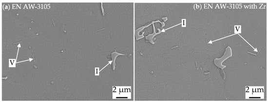 SEM images of the etched alloys, (a) EN AW-3105 and (b) EN AW-3105 with Zr, after homogenisation at 430 °C for 1 h. Particle types I and V are described in the text.