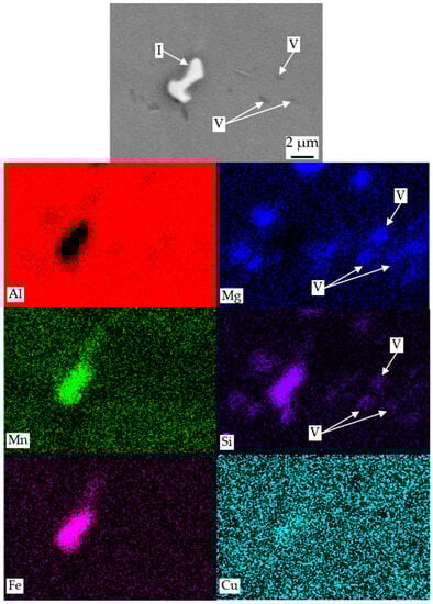 The SEM images show additional particles (marked as V) after homogenisation at 460 °C for 20 min as well as at 430 °C for 1 h (Figure 10). These particles are rod-shaped, about 1 µm in length, and appear perpendicular to each other inside one α-grain. They contain Mg and Si (revealed in the SEM-EDS, see Figure 11). These particles are probably secondary β or β′ and precipitate during slow heating to homogenisation temperature (compare with Figure 3). Table 5 summarizes the different observed particle types.