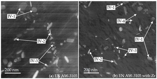 Other particles were found, such as medium-sized round particles with a diameter of 10–30 nm (type IV-3); these particles also contain Mn and Si. The last type of particles (IV-4) were only detected in the EN AW-3105 alloy with Zr. These small, round particles, with a diameter of 5–10 nm, contain Zr, according to the EDS.