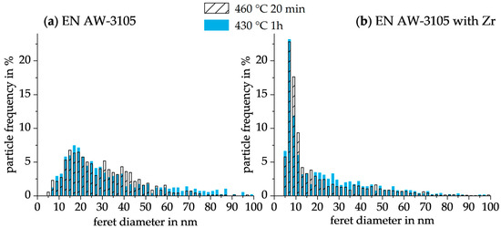 The particle distribution of the EN AW-3105 alloy with Zr is very different compared to the EN AW-3105 alloy without Zr. The most frequent particle size in this alloy is between 5 and 10 nm. The proportion of very small (<10 nm) particles is approximately 42% (430 °C for 1 h) and 46% (460 °C for 20 min) of the evaluated particles for the respective homogenisation state. This is achieved due to the small Zr-containing particles (Type V-4) seen in the TEM images (Figure 12). Again, the differences in particle distribution between the two homogenisation conditions are small (Table 6).
