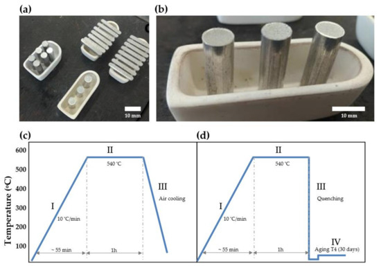 Based on the cooling step after sintering, two different groups of compacted Al–4Cu samples were prepared: the first group of samples was air-cooled, a process similar to annealing; the second group was water-quenched at 27 ± 2 °C immediately after sintering and naturally aged for 30 days, which corresponds to a typical T4 treatment [10,11,12,16,19,23,24,25,26]. Triplicate samples were used for each group to ensure the reproducibility of our results. Figure 2c,d provides a schematic representation of the sintering process and heat treatments used for both groups.