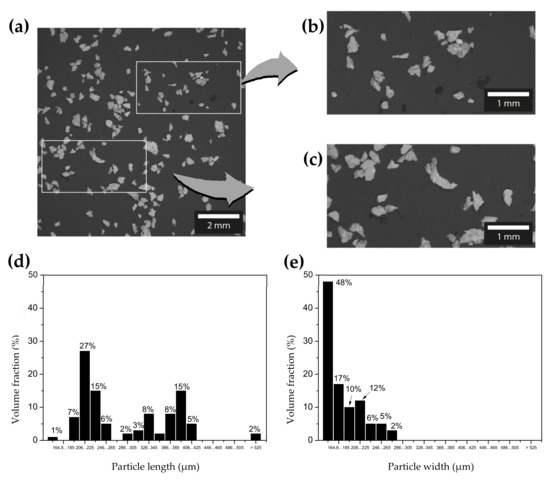 (a) Scanning electron micrographs of typical particles obtained by drilling as-cast Al–4Cu alloys. (b,c) Distinct regions of sample in (a). (d,e) Volume fractions of particles in (a) with different lengths and widths.