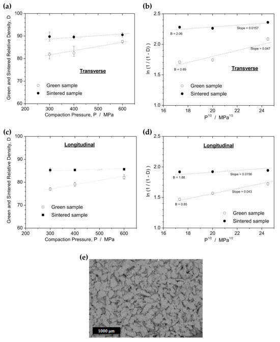 Figure 4a,c shows the densification of transverse and longitudinal Al–4Cu alloy samples, respectively, as a function of the compaction pressure. In both cases, the densification is plotted for green and sintered samples. Different equations can be used as a means to analyze the compressibility of the powders [20,27,28]. In this work, the influence of compaction pressure on the densification is described according to the following equation, reported by Fogagnolo et al. [20]: