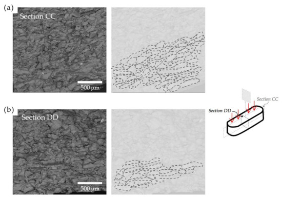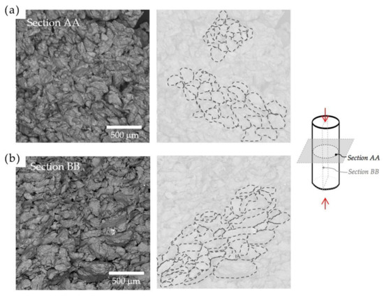 Figure 5a displays a typical SEM image of the fracture surface of a longitudinal sample across section AA. The sample was compacted in a direction perpendicular to section AA, and the compacted particles in it appear to be relatively spheroidal, as evidenced by the ghost lines. The morphology of section BB, shown in Figure 5b, evidences the presence of flattened particles when compared to the ones in section AA. Similarly, Figure 6a,b depicts the morphologies obtained after the compaction of transverse samples. Images from the sections CC and DD, both parallel to the applied pressure, evidence the predominance of flattened particles.