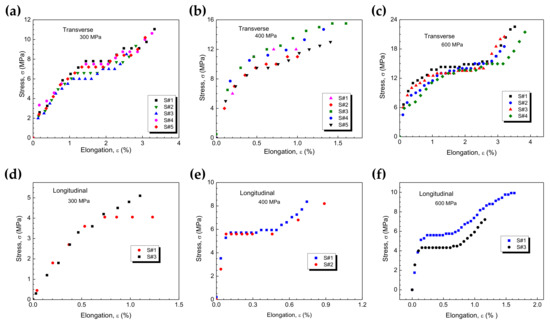 Stress–strain curves obtained from tensile tests of Al–4Cu samples cooled down via air cooling. The (a–c) transverse and (d–f) longitudinal samples were compacted using pressures of 300, 400, and 600 MPa.