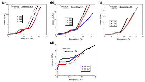 Stress–strain curves obtained from tensile tests of Al–4Cu samples cooled down via water quenching and a T4 heat treatment. The (a–c) transverse and (d) longitudinal samples were compacted using pressures of 300, 400 and 600 MPa.