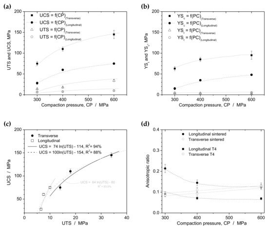 Figure 10a,b presents the YS, UTS, and UCS data as a function of compaction pressures for both transverse and longitudinal samples. Notably, the transverse samples exhibit anisotropic strength. When comparing UCS and UTS values, we observe a nonlinear relationship, as shown in Figure 10c. This behavior can be described by a single logarithmic equation () that applies to both longitudinal and transverse samples. This confirms that the morphology and chemical composition of the used powders are similar. Isotropic materials, such as multidirectional solidified as-cast alloys, typically exhibit a linear relationship between UCS and UTS.