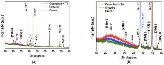 When comparing the X-ray diffraction (XRD) patterns, we observe that the green, sintered, and T4-treated samples share very similar phases. Figure 11a shows the XRD analysis of the green powder samples, sintered powders, and T4-treated powders, which were obtained from drilled compacted and treated specimens. The diffraction intensity reveals that the peaks corresponding to Al crystallographic planes (111), (200), (220), (311), and (222) (JCPDS # 01-1180) are present. Figure 11b shows that between angles 15° and 50°, the Bragg’s planes (110), (200), (210), (211), (403), (220), (112), (310), and (202) (JCPDS # 01-1180), which correspond to Al2Cu intermetallic crystallographic planes, are present, as previously reported [17,19,23,24,25,26,35,36,37,38]. It is also observed that the coherent Al2Cu phases, designated as θ’ and θ”, are not substantially identified at angles ~23° and ~31° [17,38].