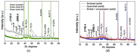 These comparisons aim to illustrate that there are no significant differences when comparing powder and compacted samples. The compacted samples exhibit more pronounced peaks corresponding to the θ’ and θ” phases, as well as other phases at angles higher than 50°, as shown in Figure 11c. Additionally, Figure 11d confirms that the XRD patterns remain unchanged after heat treatment and testing under compressive loading.