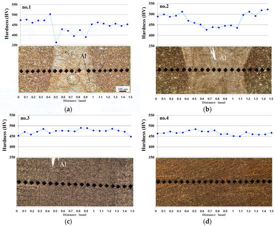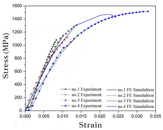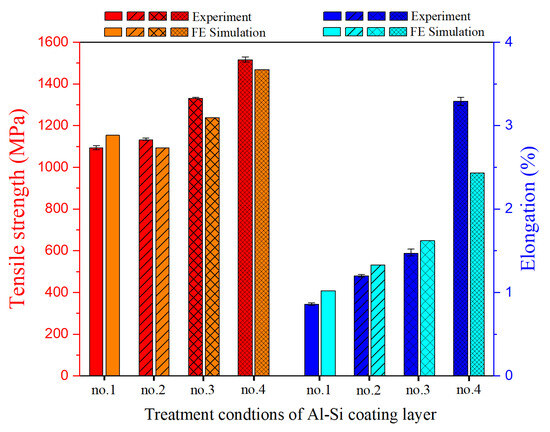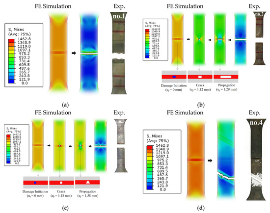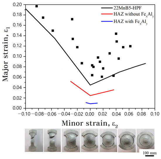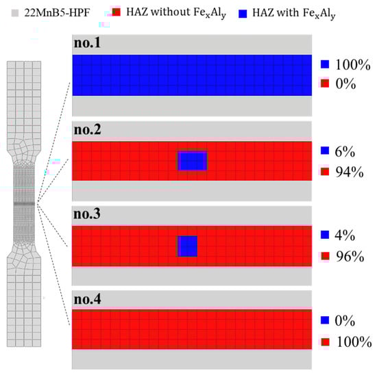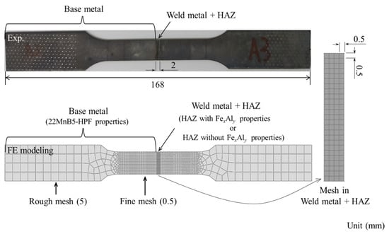 - In the FE simulation, the different mechanical properties were applied to material sections such as 22MnB5-HPF and HAZ with and without FexAly. When the different damage evolutions were given using the displacement method with Equation (4), the fracture occurred first at the HAZ with FexAly, and then crack propagation to HAZ was implemented.