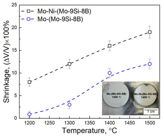 - The addition of 1 wt.% of Ni to the mixture of 60 wt.% Mo—40 wt.% (Mo-9Si-8B) powder increases the kinetics of the PLS process in the temperature range between 1200 °C and 1500 °C of the composite: the shrinkage changes from 8 to 19%, while without the activator the shrinkage is in the range of 0.9–12%.