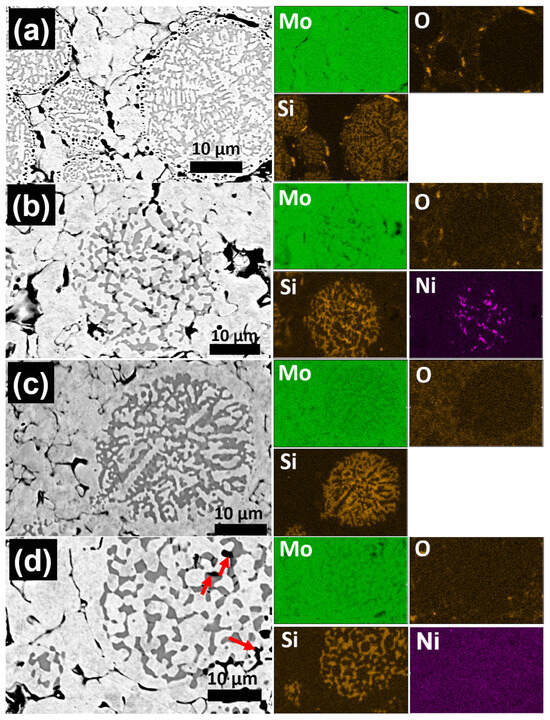 - The addition of 1 wt.% Ni increases the diffusion rate of Mo both in the matrix and in the Mo-9Si-8B particles, which reduces the influence of the Kirkendall effect at a sintering temperature of 1400 °C. Moreover, there is no diffusion of Si from the volume of Mo-9Si-8B particles to their surface with the subsequent formation of silicon oxide.