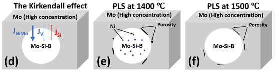 - During PLS at temperatures between 1200–1400 °C, a significant Kirkendall effect occurs in the composite Mo-(Mo-9Si-8B), which leads to the formation of porosity at the interface between the Mo matrix and Mo-9Si-8B particles.