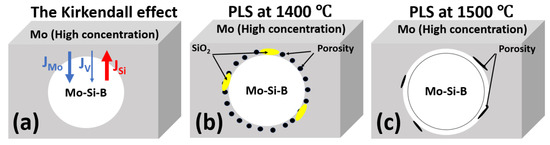 - During PLS at temperatures between 1200–1400 °C, a significant Kirkendall effect occurs in the composite Mo-(Mo-9Si-8B), which leads to the formation of porosity at the interface between the Mo matrix and Mo-9Si-8B particles.