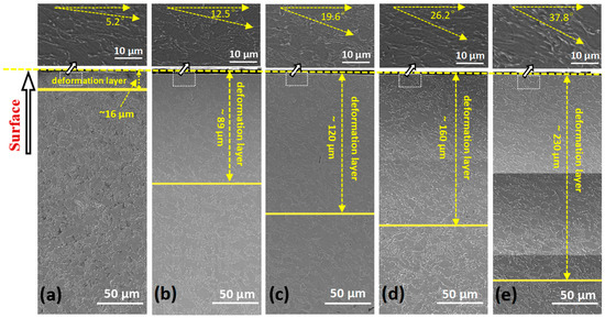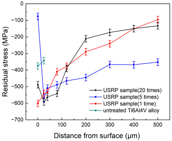 - Ultrasonic rolling processing can cause cumulative plastic deformation on the surface of a Ti6Al4V alloy, refine the surface grains, and introduce residual compressive stress. Increasing the processing passes will deepen the grain refinement layer and significantly improve the surface hardness of the Ti6Al4V alloy. The depth of the plastic deformation layer for Ti6Al4V alloy can reach 230 μm after twenty passes of ultrasonic rolling, but excessive processing passes will adversely affect the surface integrity and cause the stress relaxation. Five passes of processing can introduce a more stable residual stress field, which can still reach a stress value of −390 MPa at a depth of 500 μm.