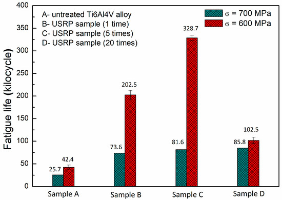 - Ultrasonic rolling processing can effectively improve the fatigue resistance of Ti6Al4V alloy, but its fatigue life does not increase with the increase in processing passes. The anti-fatigue effect of the Ti6Al4V alloy reaches a better state when only five passes are selected. Under 600 MPa, the fatigue life of the Ti6Al4V alloy treated by USRP with five passes can reach 329 kilocycles, which is 8 times higher than that of the untreated sample. The lower surface roughness, suitable fine-grained strengthening layer, deep and stable residual compressive stress field together allows for the five-passes processing to provide greater gain for the fatigue resistance of the Ti6Al4V alloy.