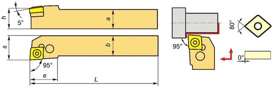 A screw-cutting lathe with a digital readout (DRA) from JET (model: GH-1640ZX; country of origin: China) was selected for machining. For experimental studies, an ISO holder (PCLNR2525-M16) and an interchangeable polyhedral insert (CNMG 160608-46, Sandvik MKTS, Rostov-on-Don, Russia) were used (Figure 1 and Table 1). It is a double-sided carbide insert, without positive corners, for finishing and semi-finishing in turning (rhombic, with an angle of 80°).