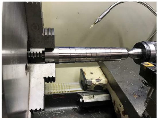 The CG and UFG workpieces of the Ti-6Al-4V alloy were turned in several zones (like the lateral surface area (LSA) of a cylinder), with lengths ranging from 8 to 10 mm, under various cutting modes, ranging from one to eight. Such LSA zones can be clearly seen in the general view of one of the Ti-6Al-4V alloy workpieces, which is shown in Figure 2. The diameter of the bars was 30 mm, and the length was 200 mm.