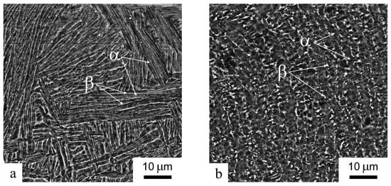Microstructure of Ti-6Al-4V alloy billets in the initial state (a) and after ECAP (b). Back-scattered electron mode in scanning electron microscope.
