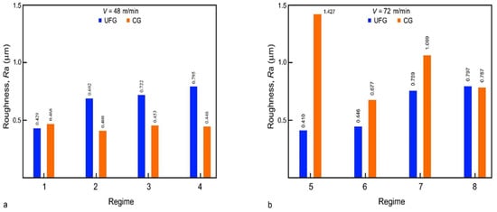 Surface roughness of CG and UFG Ti-6Al-4V alloys depending on the machining regimes with cutting speeds of (a) V = 48 m/min and (b) V = 72 m/min.