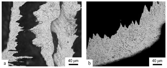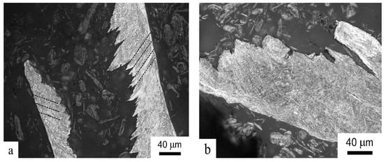 As is known, as a result of cutting, shear bands with the highest straining are observed in the microstructure of chips []. Shear bands are clearly seen in the chips obtained after processing the CG sample at a cutting speed of V = 48 m/min (Figure 6a). Microcracks and cleavages are observed, along with shear bands, in the structure of chips obtained from the CG sample with the cutting speed increased to 72 m/min (Figure 6b). Overall, this indicates that the chips were under very severe friction conditions, especially at higher processing speeds.