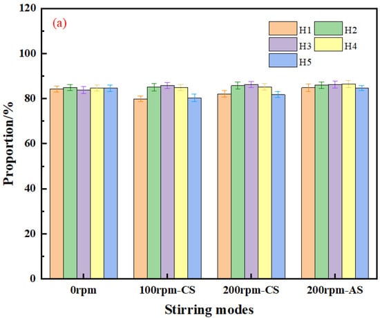 It can be seen from Figure 14b that when the magnetic field was stationary, the proportion of Sn element content in the ingot decreased from 88.5% to 65.0% from the top to the bottom. With the continuous stirring of the magnetic field, the uniformity of the Sn element in the longitudinal direction of the ingot gradually improved. When the magnetic field adopted the continuous stirring mode and the stirring speed was 100 rpm and 200 rpm, the proportion of the Sn element at the top and bottom of the ingots was 88.3% to 77.6% and 87.7% to 82.4%, respectively. With the magnetic field using an alternate stirring mode and a speed of 200 rpm, the longitudinal uniformity of the Sn element in the ingot was the best, and the proportion of Sn element at the top and bottom was 86.7% to 85.3%. The above results are consistent with the observation results presented in Figure 13. This indicates that in this study, when the alternate stirring mode was adopted and the speed was 200 rpm, the element uniformity inside the ingot was the best.