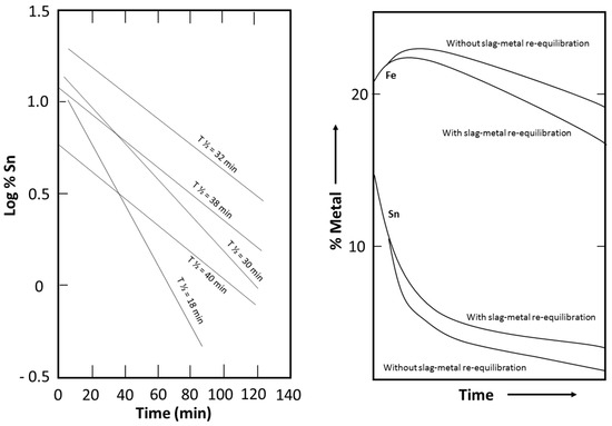 (Left) The tin content of slags during reduction (different smelts). (Right) Relation between % Fe and % Sn in slag with time (redrawn with permission) [9].