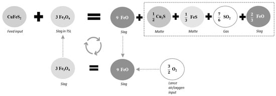 The TSL furnace is a reactor where oxidative gas is blown within the slag phase, contrary to Noranda/El Teniente tuyere bath smelters, where the above reaction occurs in the matte phase [15,16]. In the TSL furnace, “slag blowing” also leads to a different reaction mechanism when compared to the flash smelter. In the latter case, the feed can be over- or underoxidized when traveling through the burner port and reactor shaft [17]; respective corrections are undertaken through the Cu2O + FeS → Cu2S + FeO equilibrium, which does not favor too much Cu2O slag (at moderate Cu matte grades) [15]. An explanation of the slag’s role as an “oxygen conveyor” in a TSL furnace, according to [18], is shown in Figure 4. The concentrate feed (e.g., chalcopyrite, CuFeS2) reacts with the dissolved magnetite, according to Figure 4. The term “liquid oxygen” has been used instead of “dissolved magnetite” [19]. The components produced involve SO2 gas, the matte species (Cu2S, FeS) and the slag species FeO. The Fe2+ is reoxidized to Fe3+ due to the oxidizing gases blown through the lance, allowing the production of further “dissolved magnetite” and hence the mechanism of Figure 4 becomes cyclic.