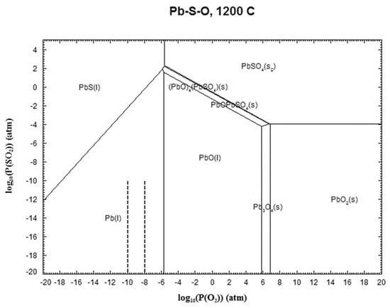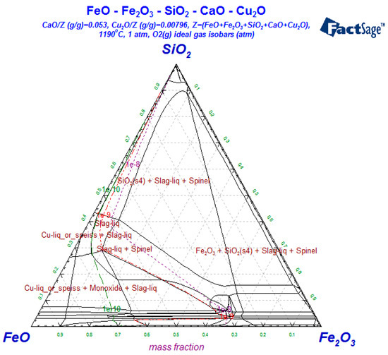 Fayalitic slag phase diagram showing PO2 isobars (10−10 atm—green line, 10−9 atm—red line and 10−8 atm—purple line) in conditions according to [23]: 5 wt.-% CaO, 0.75 wt.-% Cu2O and at 1190 °C (based on [24]).