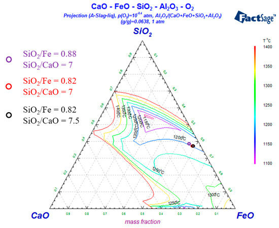Figure 7 depicts the CaO-FeO-SiO2-Al2O3 system at a fixed alumina content of 6 wt.-% and partial pressure of oxygen equal to 10−8.4 atm and has been presented in conjunction with the ISASMELT unit at the ILO smelter in Peru [21]. Aspects discussed in this paper are presented here, combined with additional calculations, to vividly illustrate the importance of slag chemistry in a TSL unit. The original design point of the plant involved ratios of SiO2/Fe = 0.88 and SiO2/CaO = 7.0 at a bath temperature of 1175–1195 °C. The slag liquidus temperature is confirmed at 1195 °C (a point noted in Figure 7); lower operating temperatures mean the presence of a spinel phase to an extent. At the above setpoint, undissolved silica was noted at the ILO smelter, which can be attributed to the size and type of silica. Reduction of the SiO2/Fe ratio leads to less slag production (by 6%) and allows more time for settling in the RHF units. However, it increases the slag’s total magnetite content, while its liquidus temperature is also increased (calculated here to be 1203 °C). Increasing the magnetite content to above 6.5 wt.-% (referring to total dissolved and solid magnetite—as spinel) leads to copper losses above 0.8 wt.-% in the slag as entrained matte due to high slag viscosity. Coal was added to decrease the PO2, thus regulating magnetite content to below 7 wt.-%. A reduction of the CaO flux (seashell), i.e., an increase in the SiO2/CaO ratio to 7.5, resulted in restoring the liquidus to approximately 1195 °C, according to [21]. However, the above measure results in only moderate liquidus temperature reduction according to our calculations shown in Table 1, while respective points are also noted in Figure 7.
