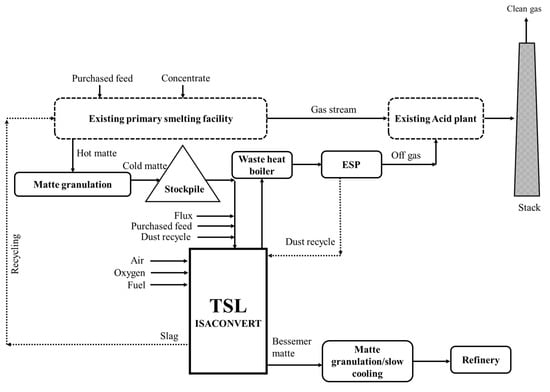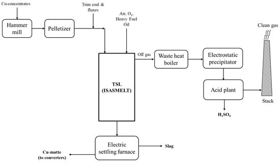 Primary copper ISASMELT flowsheet at Mufulira smelter, Zambia (redrawn with permission from The Minerals, Metals & Material Society) [37].