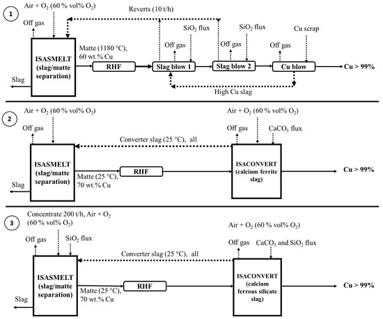 Process flowsheet (redrawn with permission) of (1) ISASMELTTM + Peirce–Smith, (2) ISASMELTTM + ISACONVERTTM calcium ferrite, (3) ISASMELTTM + ISACONVERTTM ferrous calcium silicate [39].