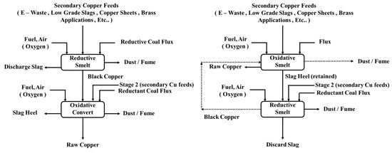 In addition, the SiO2/Fe ratio (mol/mol) suggested for AUSMELT and ISASMELT furnaces is in the range of 0.6–0.7 and 0.65–0.85, respectively. Too-low SiO2/Fe ratios have been shown to correspond to high total (dissolved + solid) magnetite content in the slag (i.e., resulting in the high activity of Fe2O3 in the slag, Equation (9)). On the other hand, too-high ratios do not facilitate the reaction mechanism during smelting (shown in Figure 4) and are discussed within Equations (4)–(6) [21]. The SiO2/Fe ratios are mentioned within the dedicated paragraphs below when examining the operation of different industrial plants. On occasion, they differ from the noted ranges.