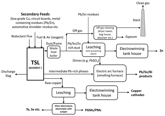 - Kandalam, A.; Zschiesche, C.; Burrows, A.; Tesch, T.; Lischeid, F. Upgrading the TSL smelter (Ausmelt®) at Nordenham to treat low-Pb and complex feed materials. In Proceedings of the European Metallurgical Conference (EMC) 2023, GDMB, Düsseldorf, Germany, 11–14 June 2023. [Google Scholar]