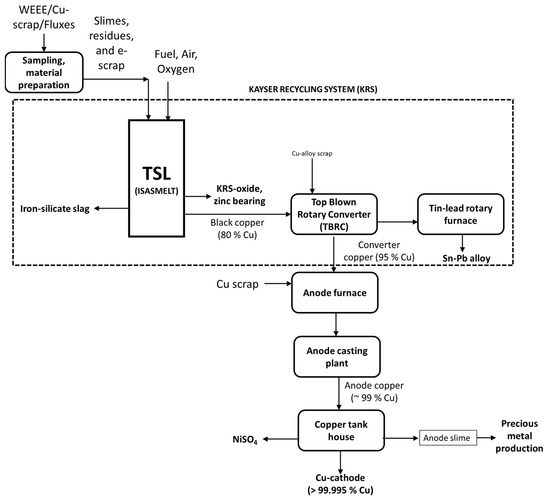 - Alvear Flores, G.R.F.; Nikolic, S.; Mackey, P.J. ISASMELT™ for the recycling of E-scrap and copper in the US case study example of a new compact recycling plant. JOM 2014, 66, 823–832. [Google Scholar] [CrossRef]
