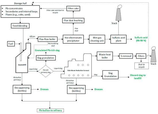 - Sibony, M.; Basin, N.; Lecadet, J.; Menge, R.; Schmidt, S. The Lead Bath Smelting Process in Nordenham, Germany. In Proceedings of the TMS (The Minerals, Metals and Materials Society): Lead-Zinc Symposium, Nashville, TN, USA, 22–25 October 2000. [Google Scholar]