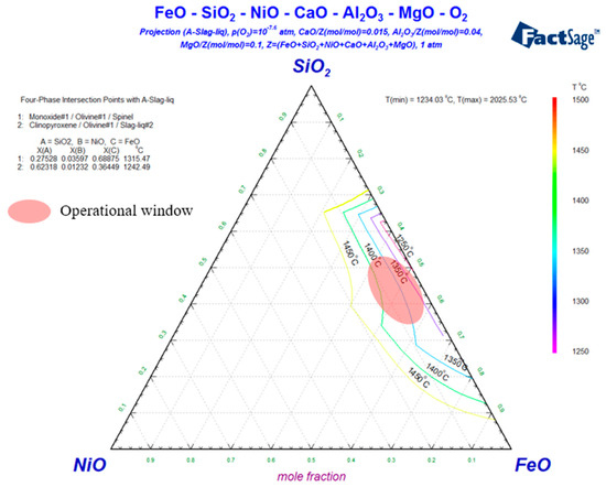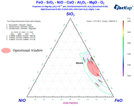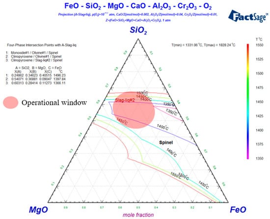 The simplified phase diagram associated with the SiO2-FeO-Fe2O3-CaO-Cu2O system at fixed 5 wt.-% CaO, 0.75 wt.-% Cu2O and 1185 °C is shown in Figure 6. The fixed conditions correspond to [23]. However, further slag components are not considered. The equilibrium of the solid magnetite-forming reaction (Equation (9)) is depicted in the phase diagram of Figure 6 as the boundary between the liquid “slag” and the “slag + spinel” regions (to the right of the liquid “slag” region). The latter is unwanted since it leads to a viscous slag, while solid magnetite settles at the bottom of the furnace and is sometimes aggressive towards the refractory (depending on its chemical composition) and hinders matte/slag separation. Matte smelting units usually operate on the above-mentioned boundary. TSL furnaces can tolerate high amounts of solid magnetite due to associated turbulence, not allowing solids to settle. The “division” of the liquid slag area in Figure 6 into a “Slag-liq + Cu (liq)” and a “Slag-liq” area expresses the creation of a copper phase at low oxygen potentials (<10−10 atm; not realistic for matte smelting) due to Cu2O reduction.