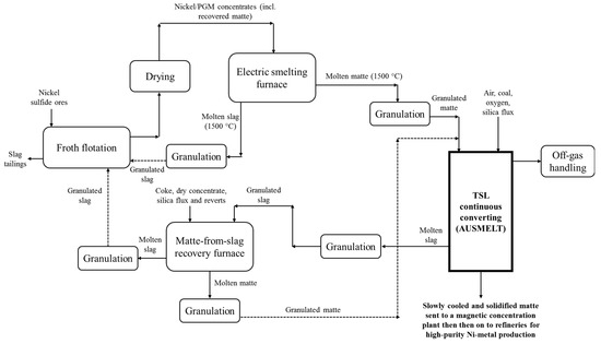 - Andrews, R.; Matusewicz, R.; Aspola, L.; Hughes, S. Outotec’s Ausmelt Top Submerged Lance (TSL) technology for the Nickel Industry. In Proceedings of the Ni-Co 2013, TMS, San Antonio, TX, USA, 3–7 March 2013; Springer: Cham, Germany, 2013. ISBN 978-3-319-48147-0. [Google Scholar]