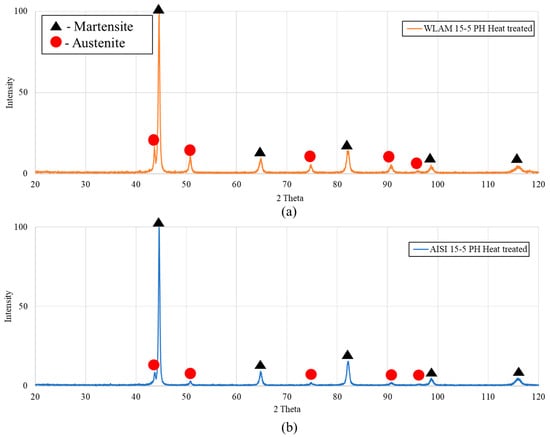XRD analysis post-heat treatment: (a) WLAM 15-5 PH alloy and (b) counterpart AISI alloy.