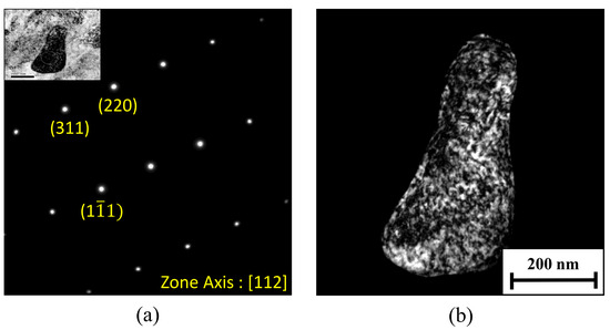 To characterize the main precipitation hardening phase in post-heat-treatment WLAM alloy, TEM analysis was carried out at the interface between this precipitate and the alloy matrix, as shown in Figure 5 and Table 3. This disclosed the presence of a semi-coherent precipitate in the form of a ε-Cu phase that was uniformly distributed throughout the martensitic matrix. The size of this phase was about 20 nm, which comes in line with the observations of Sarkar et al. [36] that explore the microstructure of 15-5 PH stainless steel produced using the SLM process.