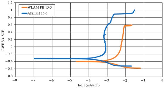 Potentiodynamic polarization curves of WLAM PH 15-5 and AISI alloy.