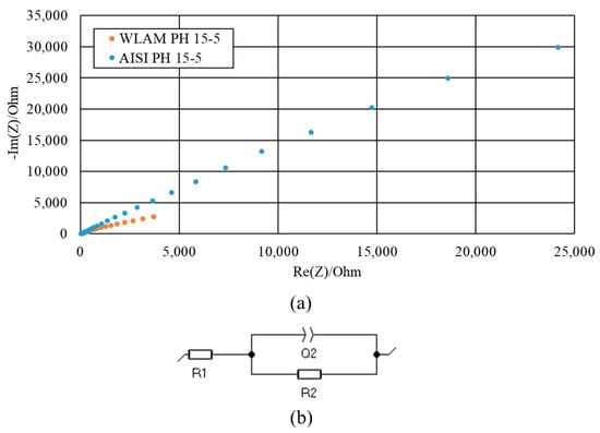 Impedance spectroscopy analysis of WLAM and AISI alloys: (a) Nyquist diagrams; (b) fitted electrical equivalent circuit (R1—solution resistance, R2—charge transfer resistance and Q2—capacitance of the double layer).
