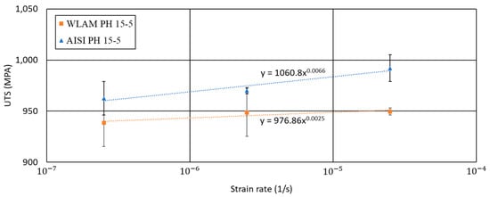 Ultimate tensile strength (UTS) vs. strain rate of WLAM 15-5 PH and its counterpart AISI alloy.