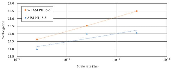 Elongation vs. strain rate of WLAM 15-5 PH and its counterpart AISI alloy.